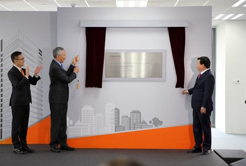 | Le PM singapourien, Lee Hsien Loong (2e, gauche), et le vice-PM vietnamien, Trinh Dinh Dung (droite), lors de la cérémonie d’inauguration du Centre d’Affaires de Mapletree. |