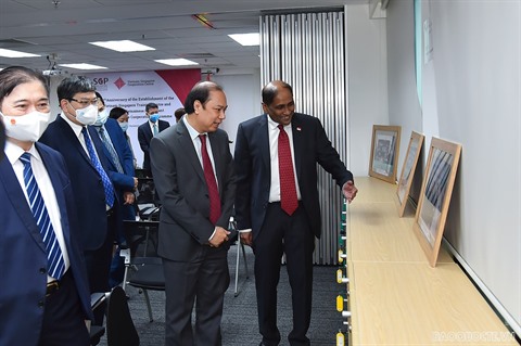 | L'ambassadeur de Singapour, Jaya Ratnam (droite), présente les activités du VSCC au vice-ministre vietnamien des Affaires étrangères Nguyên Quôc Dung. |