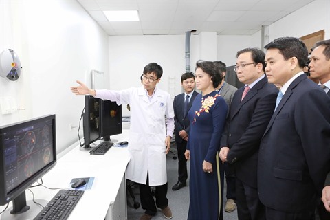| Nguyên Thi Kim Ngân et des dirigeants de Hanoï visitent, le 27 novembre, le Centre des hautes techniques digestives de Hanoï à l’hôpital Saint-Paul. |