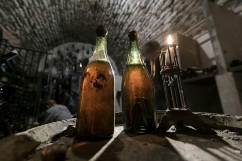 | Des bouteilles de "vin jaune" datant de 1774, le 22 mai 2018 à Arbois. |