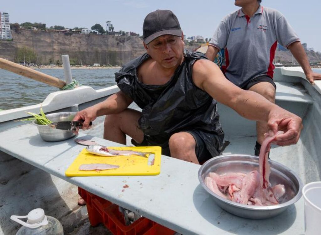 | Le pêcheur César Melgarejo prépare un ceviche traditionnel pour lui et ses collègues à bord d'un petit bateau au large de Lima. |