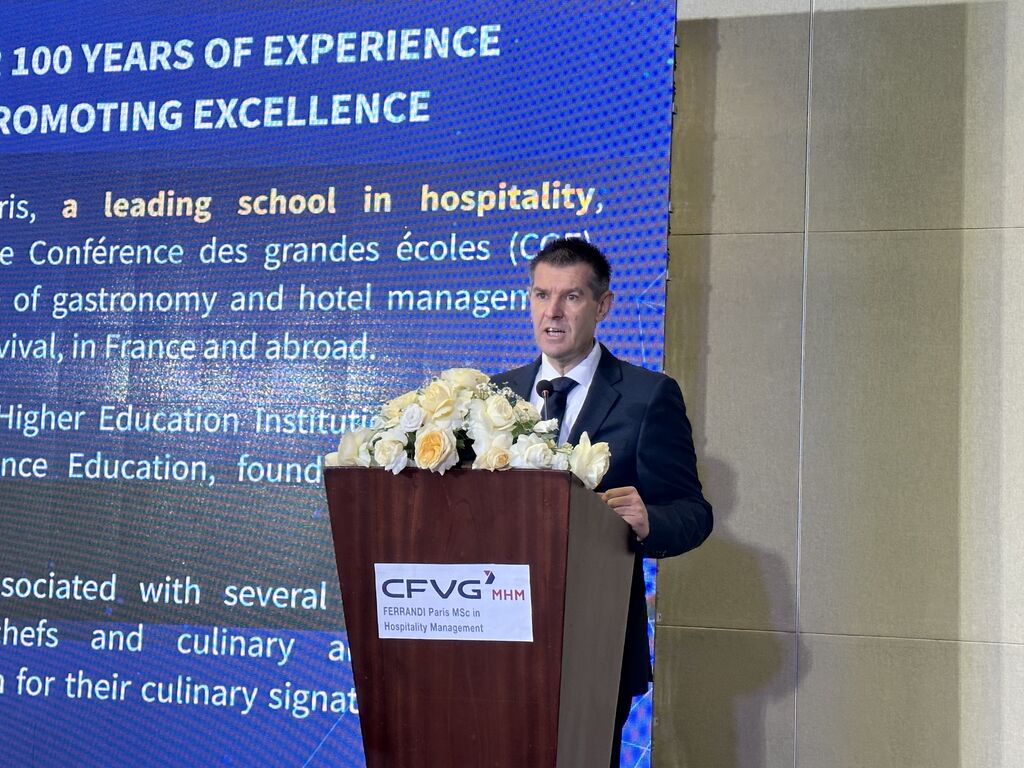 | Le Prof. Dr. Rodolphe Bardot, directeur académique et du développement des programmes master à FERRANDI Paris, expose les axes de coopération avec le CFVG dans le cadre du programme MHM. |