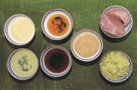 | Les principaux ingrédients du cha côm : côm frais, nuoc mam, sucre et viande de porc... |