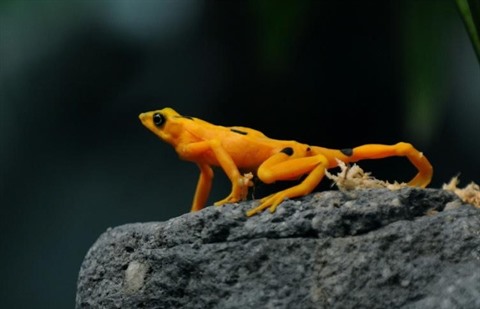 | Une grenouille dorée (+Atelopus zetequi+) dans un parc zoologique de la vallée d'Anton, à l'est de la ville de Panama, le 16 avril 2009. |