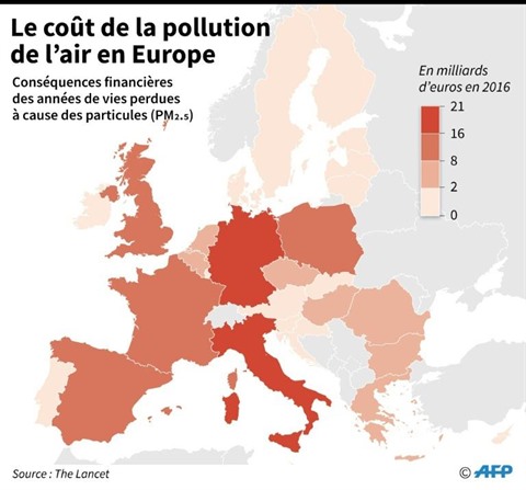 | Carte des conséquences économiques de la pollution aux particules PM2.5 en Europe, selon une étude de "The Lancet". |