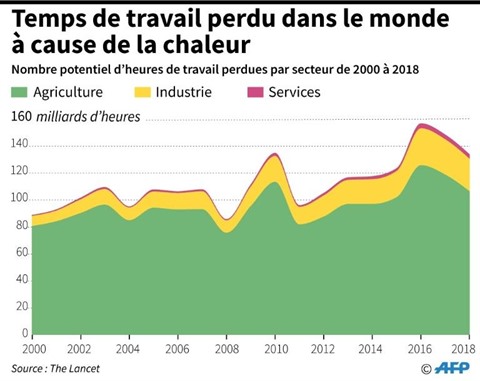 | Graphique montrant les heures de travail perdues en raison de la hausse des températures, en milliards d'heures, de 2000 à 2018. |