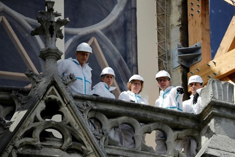 | La ministre du Travail, Muriel Pénicaud, (centre) et le préfet d'Île-de-France Michel Cadot (gauche) visitent le chantier de Notre-Dame le 19 août. |
