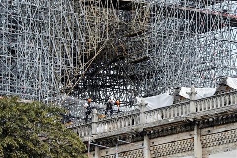 | Des ouvriers sur le chantier de consolidation de Notre-Dame le 19 août. |