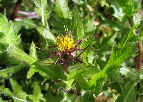 Il s’agit d’une plante annuelle à tige rouge, à feuilles alternes, charnues, marquées de nervures claires, à bord épineux et à fleurs jaunes, en capitules de 3 à 4 cm de diamètre, à involucre doté d’aiguillons. On cueille ses feuilles et ses capitules en automne.