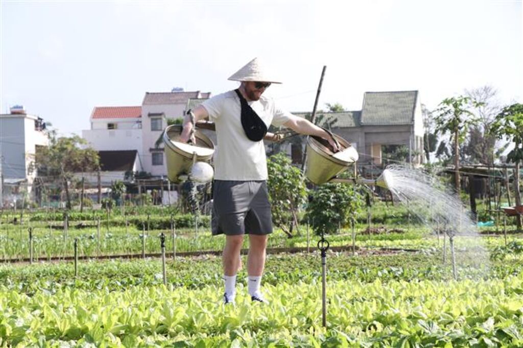 | Au village maraîcher de Trà Quê à Hôi An, ville de Dà Nang (Centre), les touristes s'initient avec plaisir au travail de la terre, de la plantation à l'arrosage des légumes. |