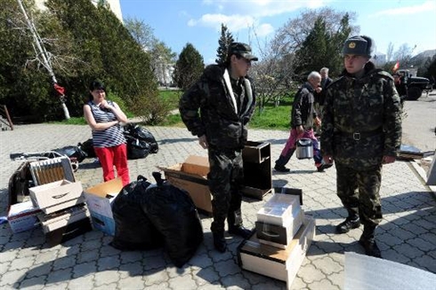 | Des pilotes ukrainiens avec leurs affaires quittant la base aérienne de Belbek près de Sébastopol, en Crimée, le 21 mars. |