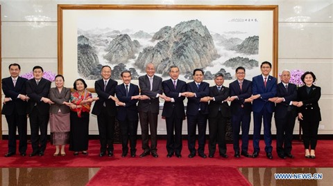 | Le conseiller d’État chinois et ministre des Affaires étrangères, Wang Yi (7e, droite), et les ambassadeurs des États membres de l’ASEAN. |