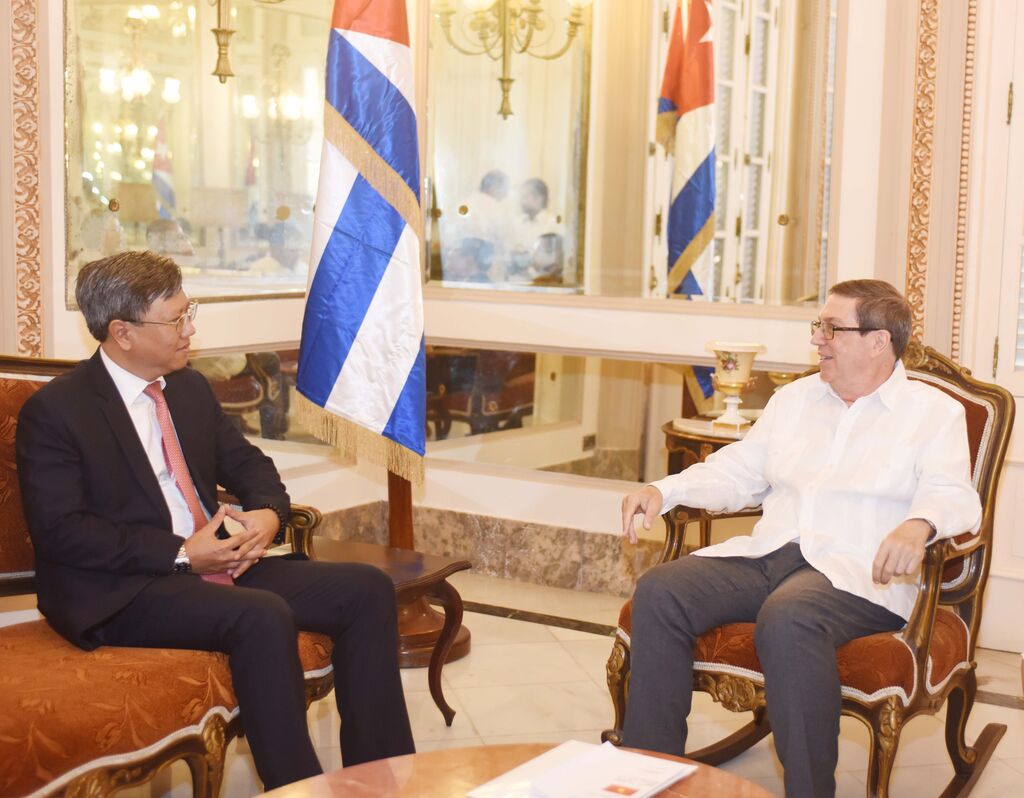 | Le ministre cubain des Affaires étrangères, Bruno Rodríguez Parrilla (droite), recevant l’ambassadeur du Vietnam à Cuba, Lê Quang Long. |