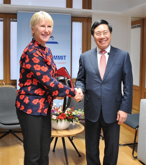 | Le vice-Premier ministre et ministre vietnamien des Affaires étrangères Pham Binh Minh et la ministre suédoise des Affaires étrangères Margot Wallstrom. |