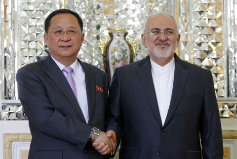 | Le ministre nord-coréen des Affaires étrangères, Ri Yong Ho (gauche), et son homologue iranien Mohammad Javad Zarif à Téhéran, le 7 août. |