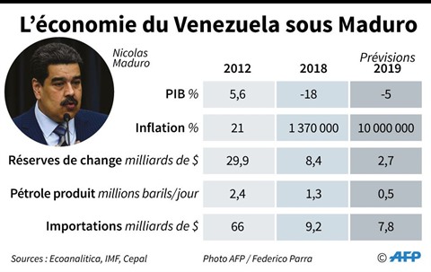 Le Fonds monétaire international (FMI) prévoit une chute du PIB de 25% cette année au Venezuela, ainsi qu'une hyper-inflation de 10.000.000% et un taux de chômage de 44,3%. En 2000, ce pays se plaçait au deuxième rang des puissances économiques d'Amérique du Sud.