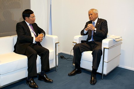 | Rencontre entre le vice-Premier ministre vietnamien et ministre des Affaires étrangères Pham Binh Minh (2e, droite) et le chef de la diplomatie norvégienne Borge Brende. |
