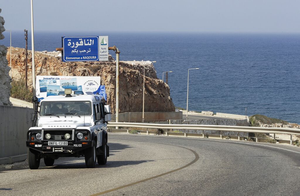 | La force FINUL patrouille sur la route de Naqoura, à la frontière entre Israël et le Liban. |