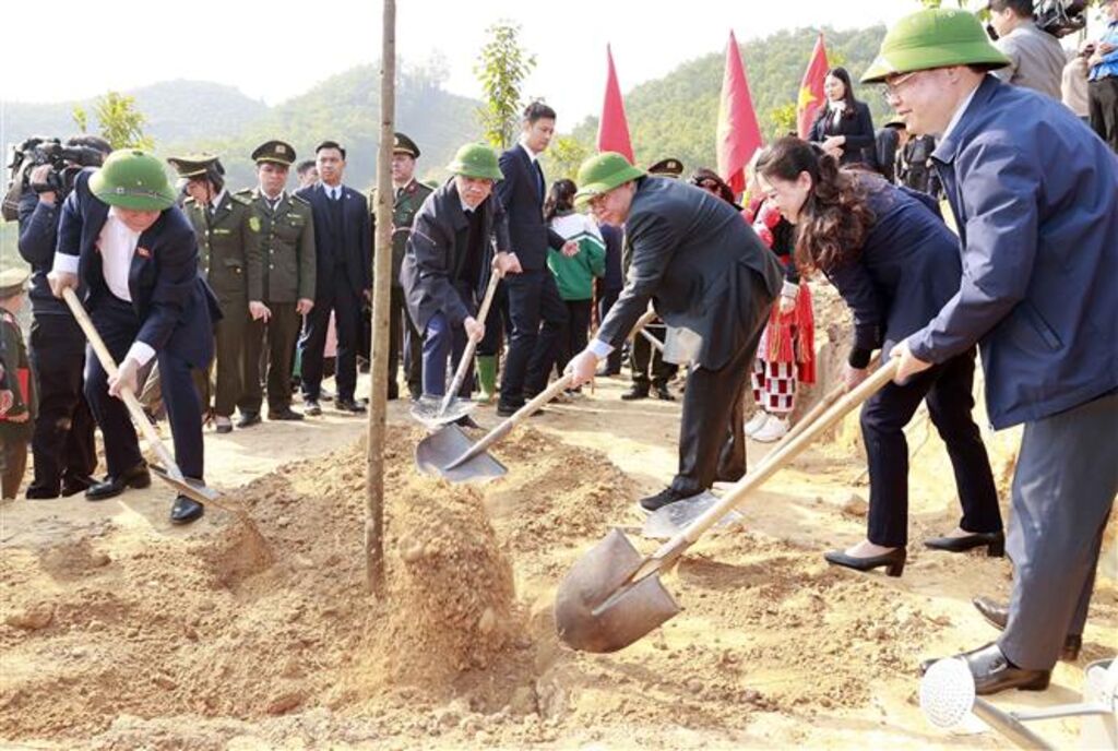 | Le président de l’AN, Vuong Dinh Huê (droite), plantant un arbre dans la commune de Chân Son, province de Tuyên Quang, le 30 janvier. |