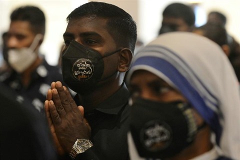 | Des catholiques srilankais prient au cours d'une messe pour commémorer les attentats de 2019 le 7 mars 2021 à Colombo. |