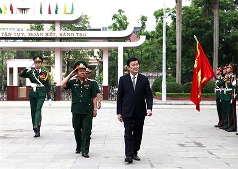 | Le président de la République, Truong Tân Sang (droite), en visite de travail à l'Académie de la défense du Vietnam, le 7 avril à Hanoi. |