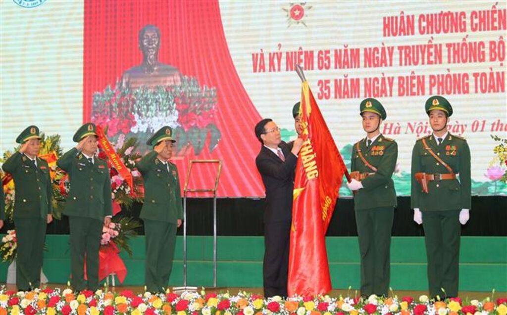 | Le président Vo Van Thuong remet l’Ordre de la victoire de deuxième classe aux garde-frontières, le 1er mars. |