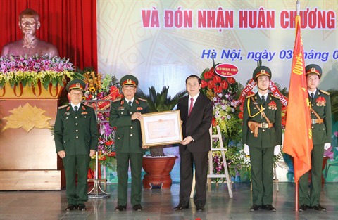 | Trân Dai Quang (centre) remet l’Ordre de l'Indépendance de 1re classe à l’Institut de la défense, le 3 janvier à Hanoï. |
