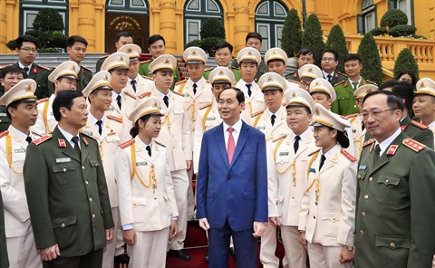 | Le chef de l’État, Trân Dai Quang (centre), entouré des jeunes policiers exemplaires de 2017. |
