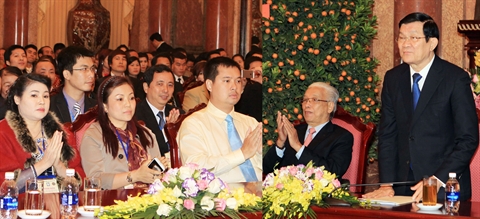 | Le président de la République, Truong Tân Sang, (droite) lors de sa rencontre, le 5 février, avec une bonne centaine d’entrepreneurs exemplaires. |