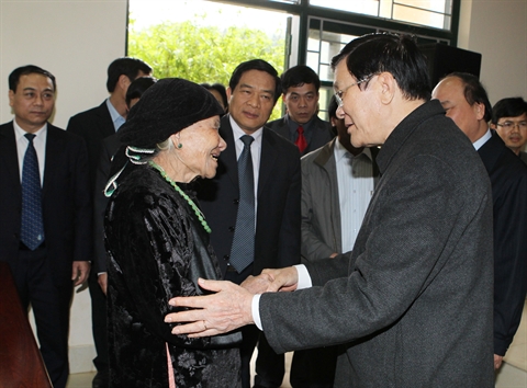 | Le président Truong Tân Sang serre la main à Hoàng Thi Khin, vétéran de la révolution et agent de liaison du Président Hô Chi Minh pendant son séjour à Pác Bó, province de Cao Bang. |