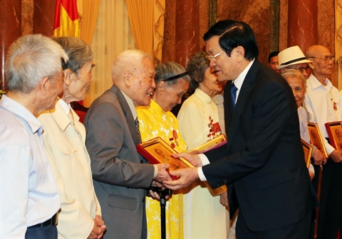 | Le président Truong Tân Sang (droite) offre des cadeaux aux anciens prisonniers révolutionnaires. |