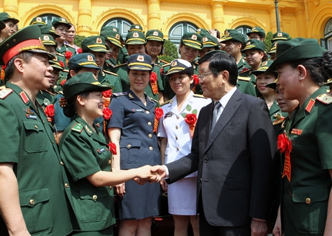 | Le président Truong Tân Sang (droite) rencontre, le 27 mai à Hanoi, une délégation composée de 55 femmes exemplaires dans les mouvements d'émulation de l'armée. |