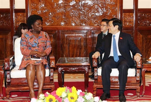 | Le président Truong Tân Sang et la directrice nationale de la BM, Victoria Kwakwa, venue prendre congé le 30 mars au terme de son mandat au Vietnam. |