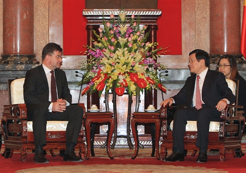 | Le président du Vietnam, Truong Tân Sang (droite), et le vice-Premier ministre et ministre slovaque des Affaires étrangères, Miroslav Lajcak, le 4 novembre. |