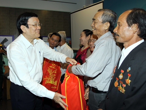 | Truong Tân Sang offre des cadeaux à d’anciens prisonniers révolutionnaires, le 11 février à Hô Chi Minh-Ville. |