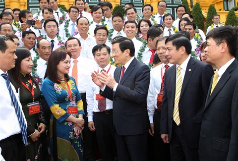| Le président de la République, Truong Tân Sang (centre), et les employés exemplaires du secteur gazo-pétrolier, le 18 mai à Hanoi. |