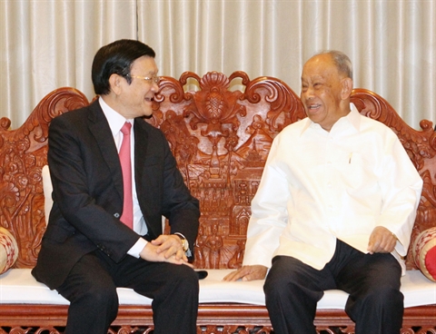 | Le président de la République, Truong Tân Sang (gauche), et Khamtay Siphandone, ancien président du Parti populaire révolutionnaire (PPRL) et ancien président du Laos, le 24 mars. |
