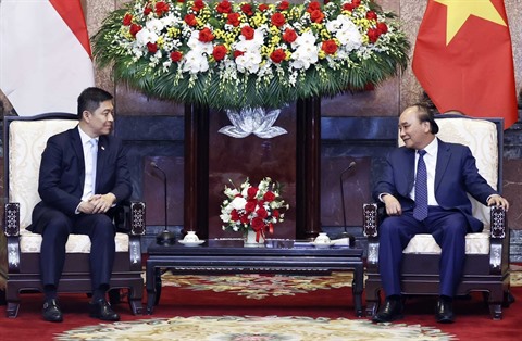 | Le chef de l'État vietnamien Nguyên Xuân Phuc (droite) et le président du Parlement de Singapour, Tan Chuan-Jin, le 19 mai à Hanoï. |