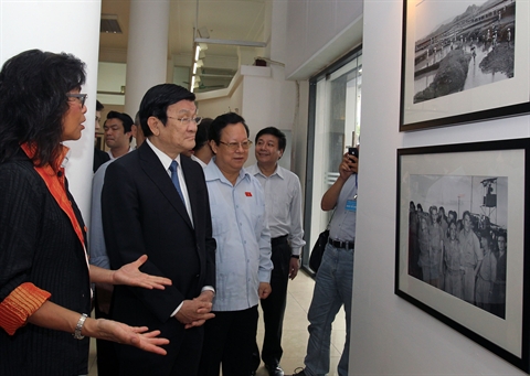 | Le président de la République, Truong Tân Sang (2e, gauche), à l'exposition "Vietnam : The Real War", le 15 juin à Hanoi. |