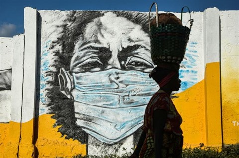 | Une fresque destinée à sensibiliser au risque du COVID-19 peinte par le groupe artistique Wachata, sur un mur de Dar es Salaam (Tanzanie), le 26 mai 2020. |