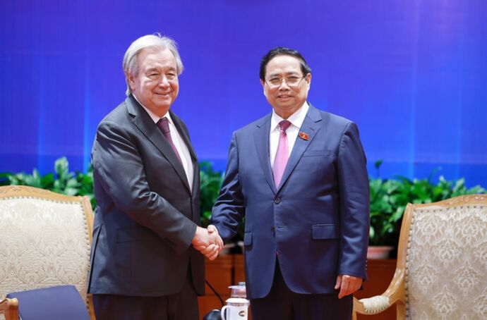 Le secrétaire général de l’ONU a rencontré le secrétaire général du Parti communiste vietnamien, Tô Lâm, le Premier ministre Pham Minh Chinh et le président de l’Assemblée nationale Trân Thanh Mân. Le président Luong Cuong a dirigé la cérémonie d’accueil officielle, tenu un entretien et donné un banquet d’État en l’honneur de M. Guterres.