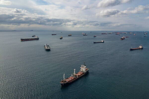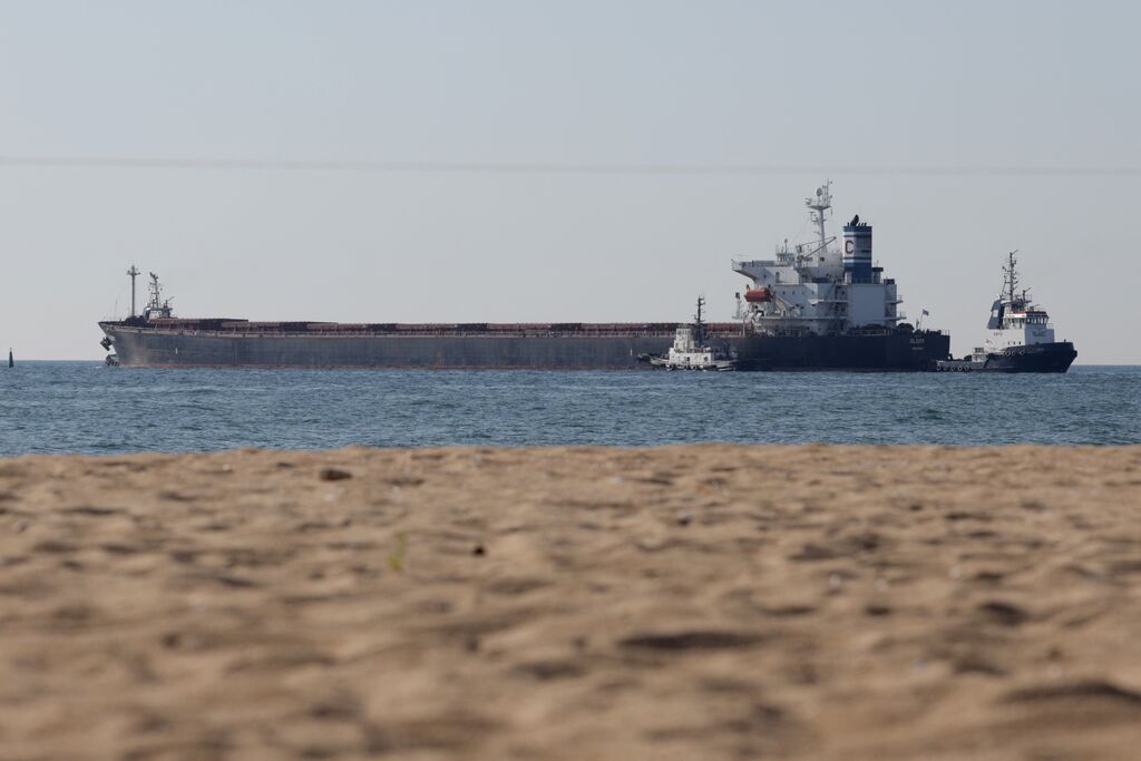 | Un navire chargé de céréales ukrainiennes accosté au détroit du Bosphore, en Turquie. |