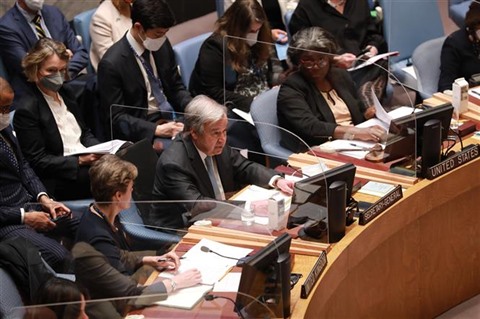 | Antonio Guterres (centre), lors de la réunion au Conseil de sécurité, le 5 mai. |