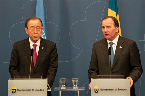 | Le secrétaire général de l'ONU, Ban Ki-moon (gauche), et le Premier ministre suédois Stefan Lofven lors d'une conférence de presse, le 30 mars à Stockholm. |