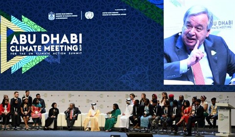| Le secrétaire général de l'ONU, Antonio Guterres, lors d'une réunion sur le climat à Abou Dhabi, aux |
