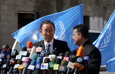 | Le secrétaire général de l'ONU, Ban Ki-moon (gauche), lors d’une conférence de presse, à l'occasion de sa brève visite le 2 février à Gaza. AFP/VNA/CVN |