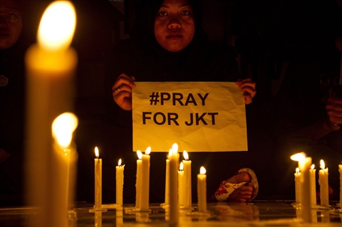 | Une Indonésienne prie les victimes des attentats qui se tiennent le matin du 14 janvier à Jakarta. |