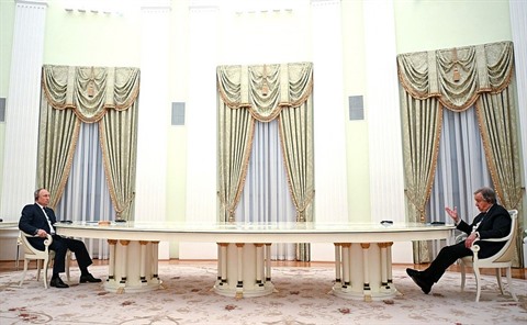 | Le président russe Vladimir Poutine (gauche) rencontre le secrétaire général de l'ONU Antonio Guterres au Kremlin, à Moscou, en Russie, le 26 avril. |