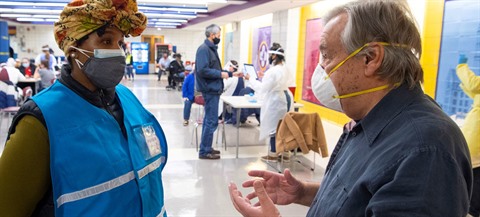 | Le secrétaire général de l'ONU, Antonio Guterres, parle avec Yeashea Braddock, gestionnaire des opérations, dans un lycée du Bronx, à New York, où il a reçu sa deuxième dose du vaccin contre le COVID-19. |