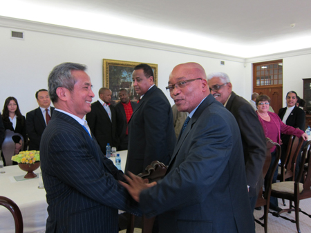 | Le président de la Confédération générale du Travail du Vietnam, Dang Ngoc Tùng (droite), et le président sud-africain Jacob Zuma, le 11 février à Pretoria. |